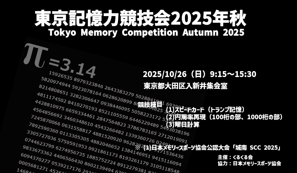 - 3,000円(何種目に出場しても同じ参加費です、一つの種目に出ない方も見学は自由ですので他の記憶力競技を是非ご観戦ください!)。ただし円周率再現競技のみの場合は参加費1,000円。