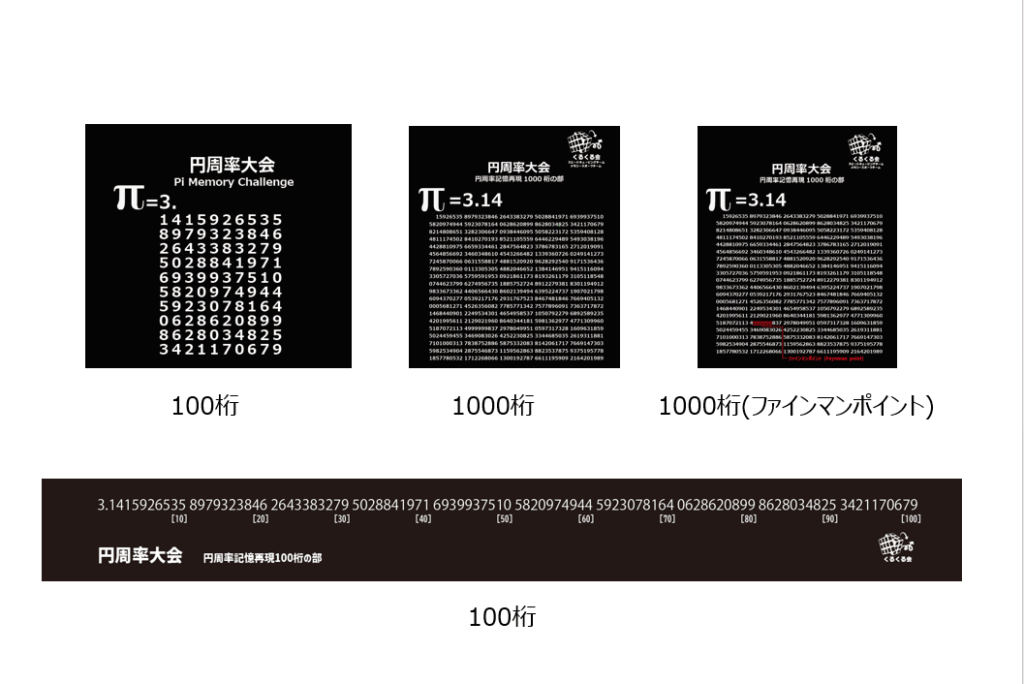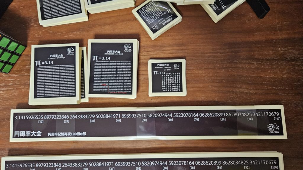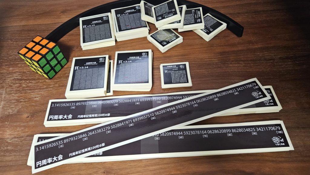 円周率シール! 03_円周率大会 2025.11.13 大人気のくるくる会オリジナル円周率シール! (1)5cm x5cmの100桁シール (2)7cm x8cmの1000桁シール (3)7cm x8cmの1000桁シール(ファインマンポイント付き) に加え (4)42cm x 4cmの100桁シール(長さはA3長辺と同じ!)が加わりました! みんなも円周率を覚えよう!