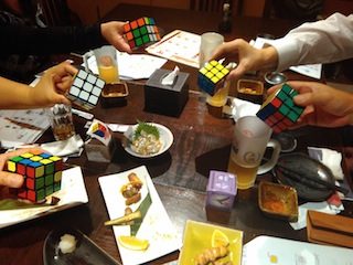 北京の某イベントでお会いした北京在住の日本の方及び中国の方と、くるくる会を大徳で開催いたしました! 前回に引き続き大徳さんで開催させていただきましたが、キューブに夢中になりすぎてアルコール以外のオーダーが殆ど入らなかった、という事態になってしまいました(結果として普通の飲み会よりも、かなり小額の支払いとなりました)。将来くるくる会が飲み屋に出入り禁止にならないように、きちんと注文係を決めてオーダーしていくようにします。