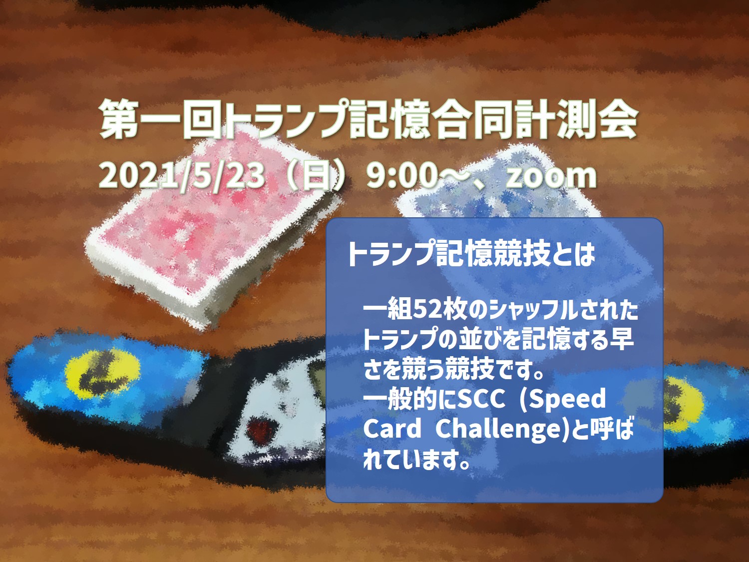 - トランプ記憶競技はSpeed Card Challenge(SCC)と呼ばれています。