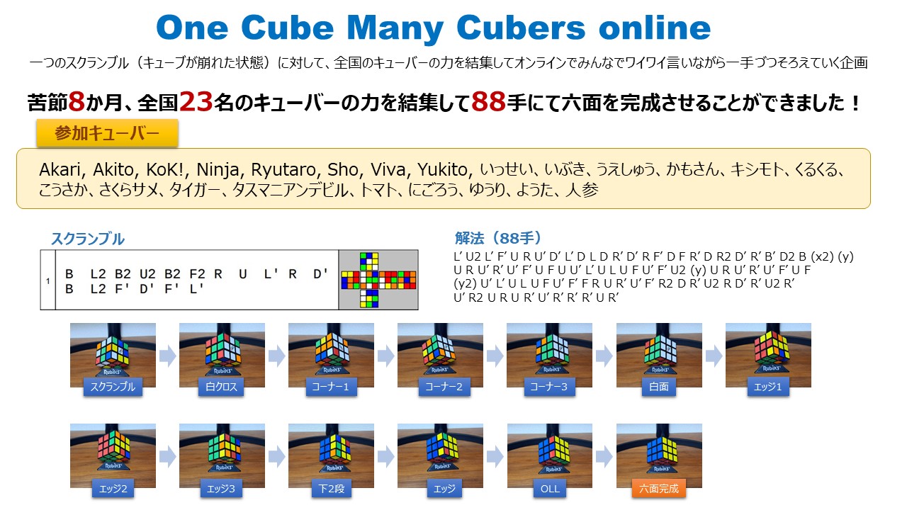 苦節8か月、全国23名のキューバーの力を結集して88手にて六面を完成させることができました!
