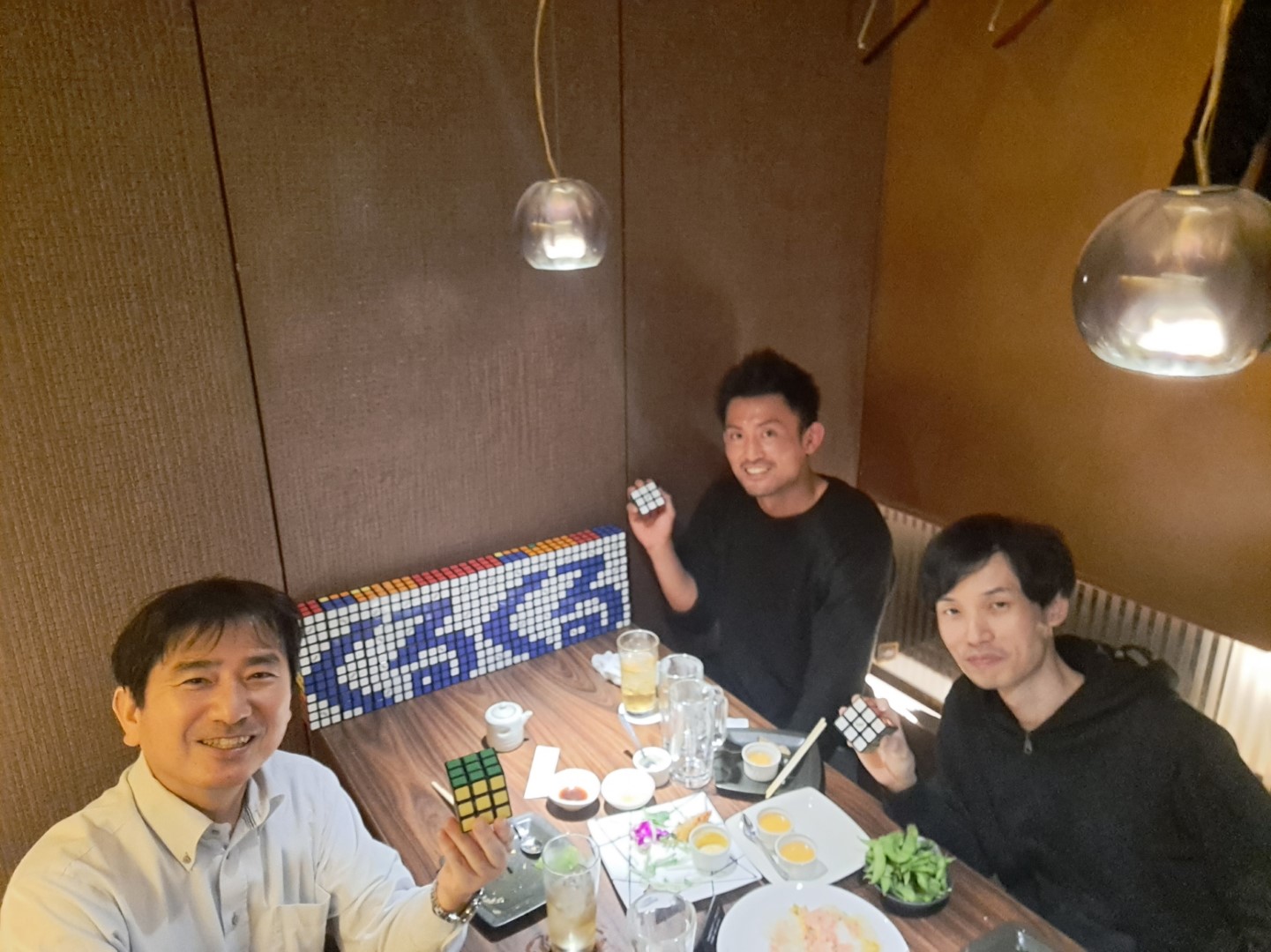 「くるくる会」と柔らかいネーミングでキッズにも参加していただいているくるくる会ですが、実は第一回創設時のメンバーはブラジリアン柔術を達人だったりウルトラマラソン愛好家だったりと体育会系の男子三名がファミレスでキューブを回す異色の集まり。当時「くるくる会」に代わる団体名候補は「マッチョキューブ会」「ムキムキ会」と一般受けしそうもないネーミング(くるくる会にして良かった、、、)。創設以来10年を優に超え、日本で最も歴史のあるキューブサークルとなりました。その創設メンバー三名が集結し、当時の振り返りと近況のキャッチアップで大いに盛り上がりました!