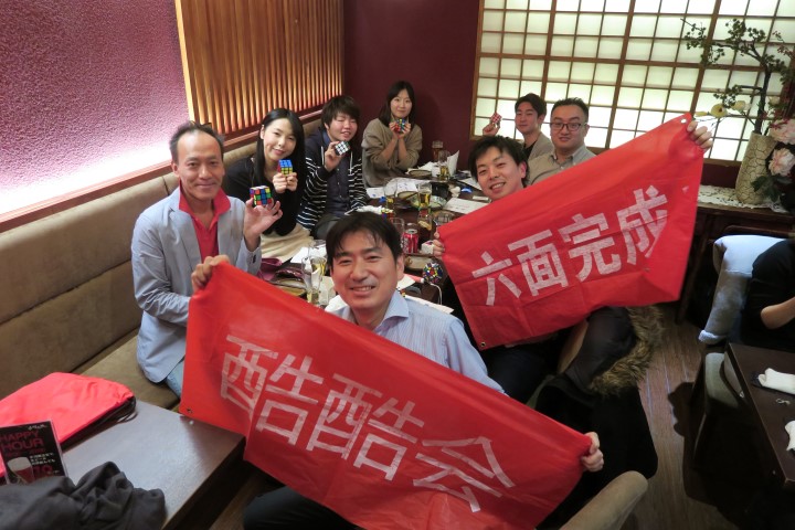 帰国を控えた主役のIクルー、前回のくるくる会参加後に集中的にトレーニングを重ね一時は指南書なしで2分を切るまでに腕を上げられ「スピードキューバー」の仲間入りをされる。北京くるくる会の牽引役として活躍された氏の帰国は非常に残念。そのIクルーの紹介で今回初参加の中国人大学院生のYクルー。幹事の不手際により中国語指南書を持参していなかったにも関わらず、日本語指南書を手がかりに6面を完成させるすご技を披露。