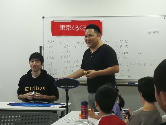 無錫(ムシャク)出張からの帰路に直接会場に来ていただいたNクルーとKuクルー。2回目の参加となるNクルーは前回参加の翌日に一日中キューブをして首を痛められたとのこと。LBLのF2L(ステップ1〜3)までは手順記憶ではなくロジックで解くほどキューブの特性を理解される。そして今回初参加のKクルー。その場でキューブを入手され、その後30分で6面を完成される天性のキューバーの予感。追加でキューブを2つ入手され、今後のキューブの普及活動に貢献してくれそう。